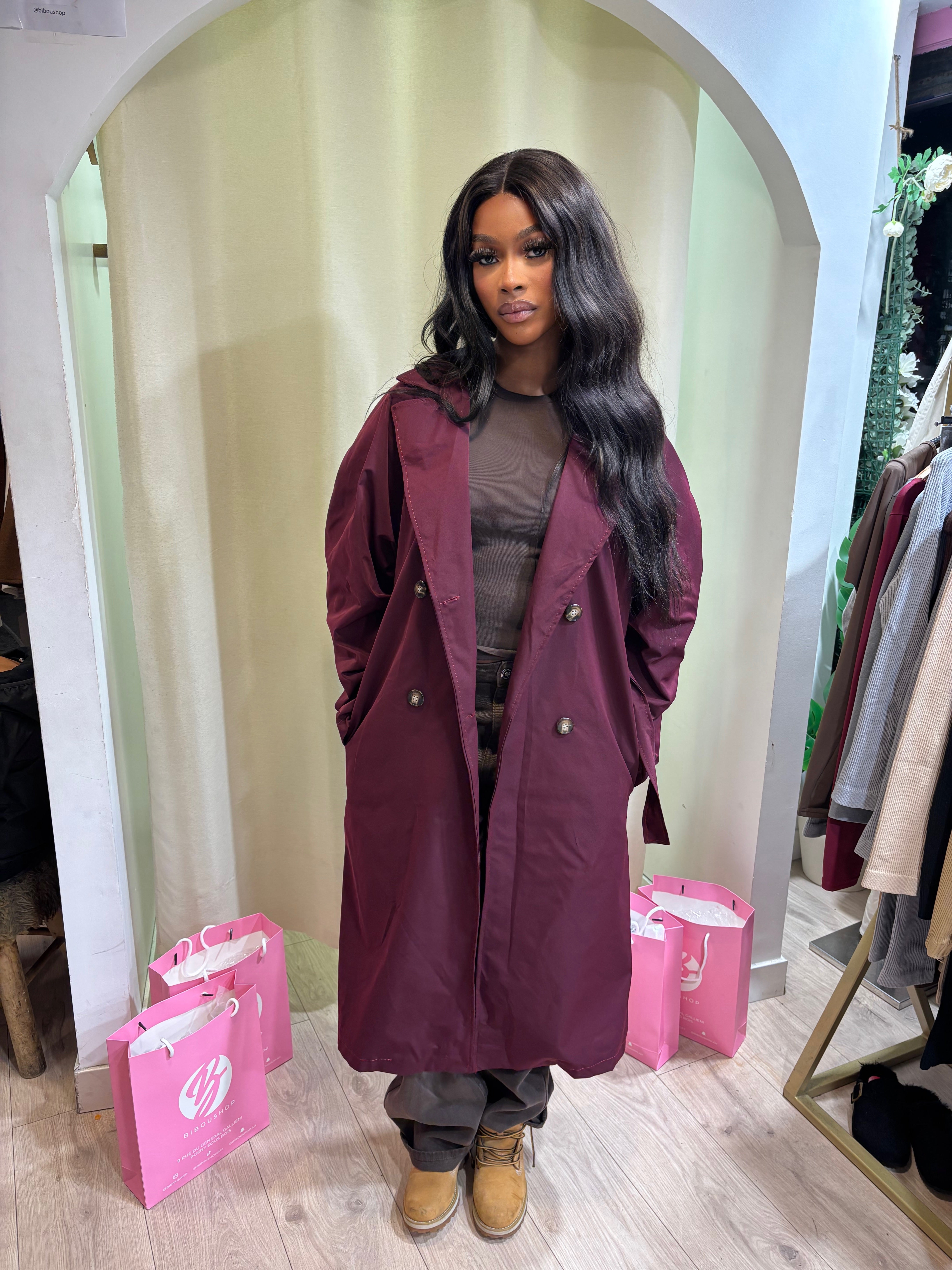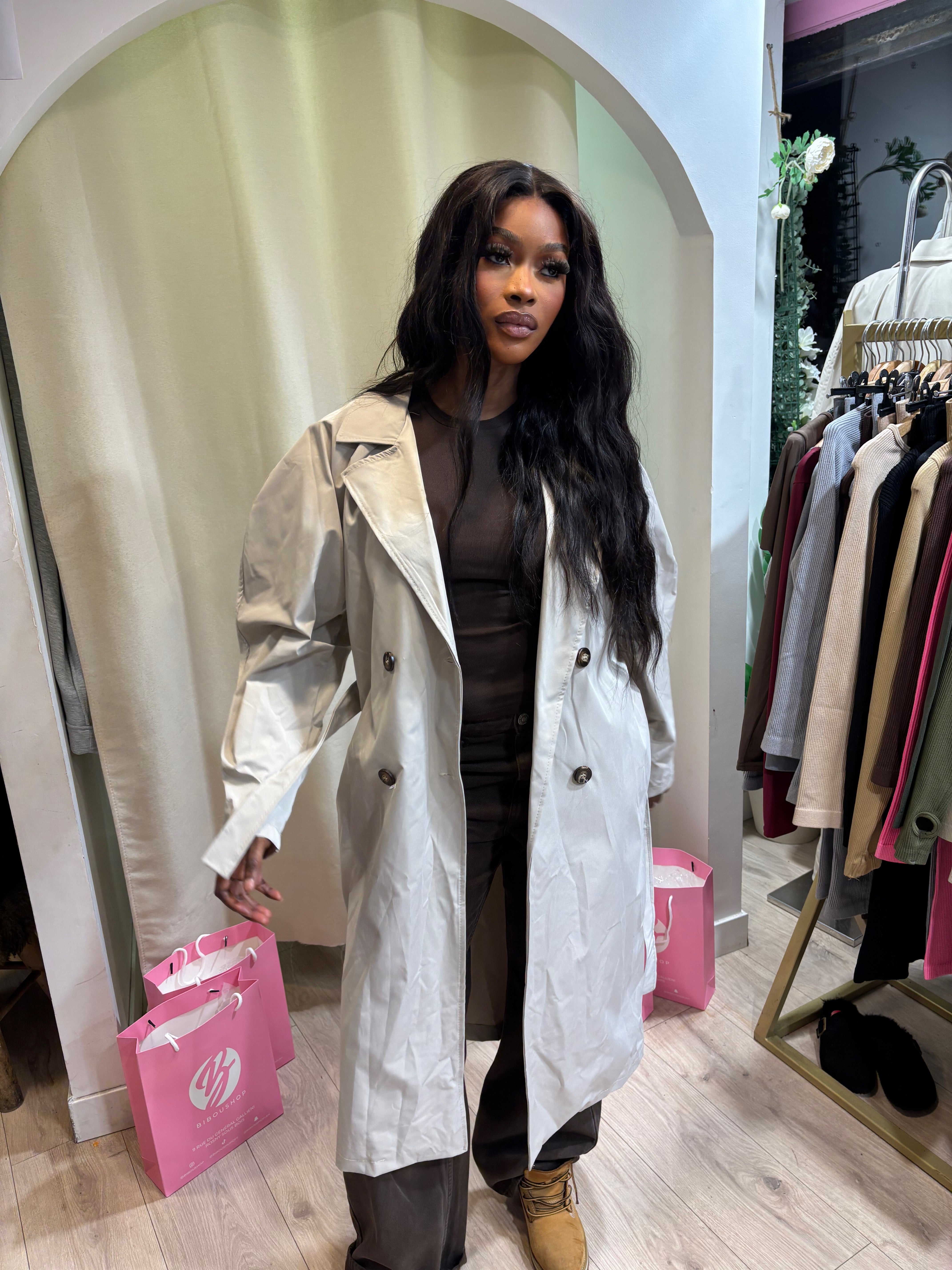 Son design long, ses manches larges et sa ceinture à nouer soulignent la silhouette tout en offrant une allure citadine affirmée.