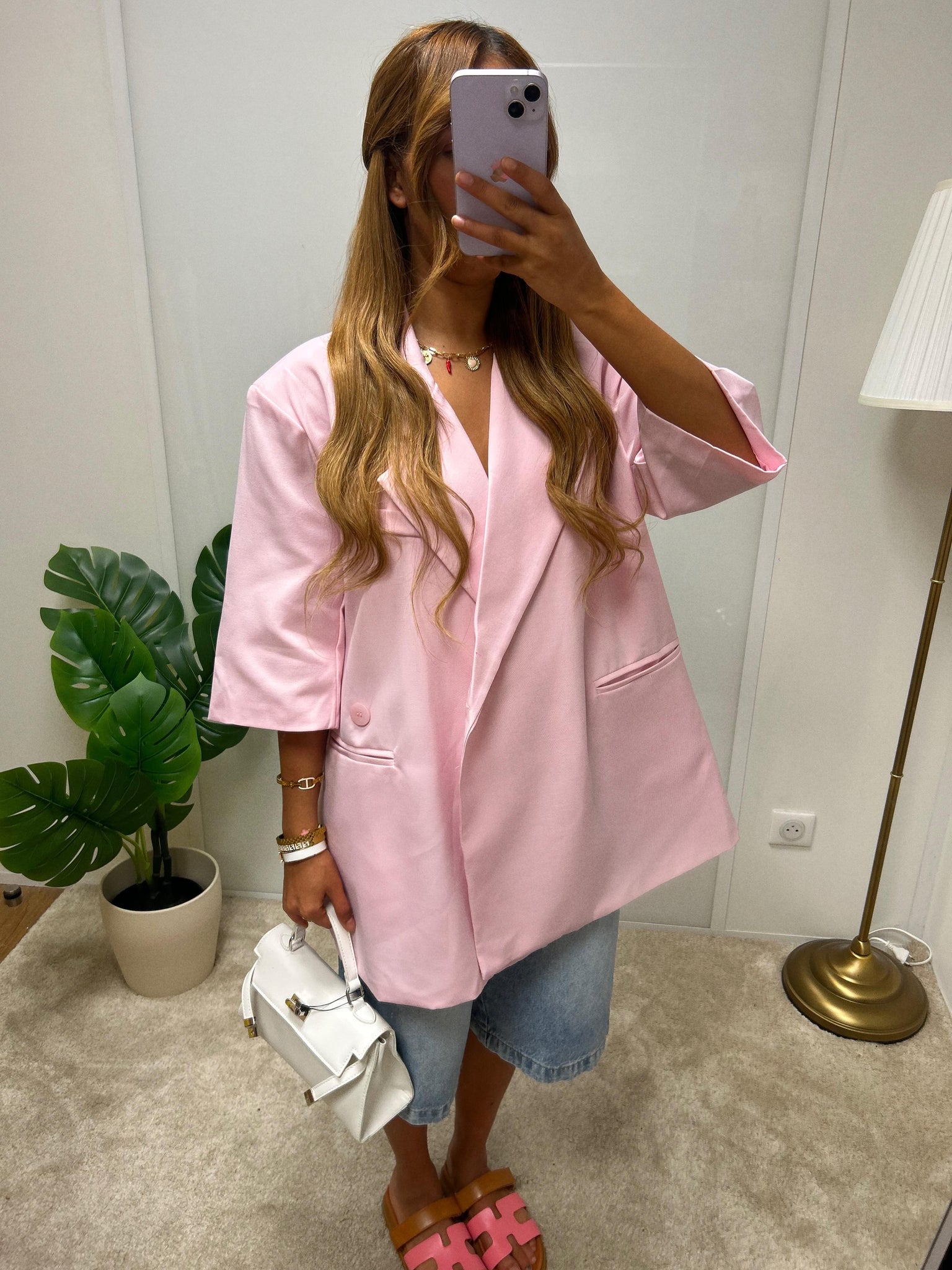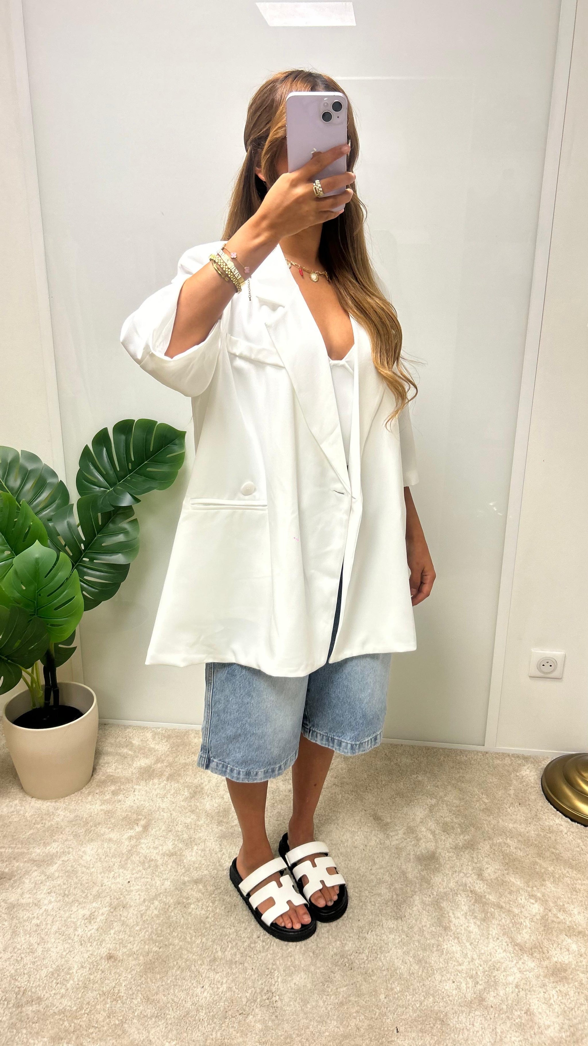 Veste blazer oversize à manches 3/4, coupe droite avec col tailleur et poches latérales.