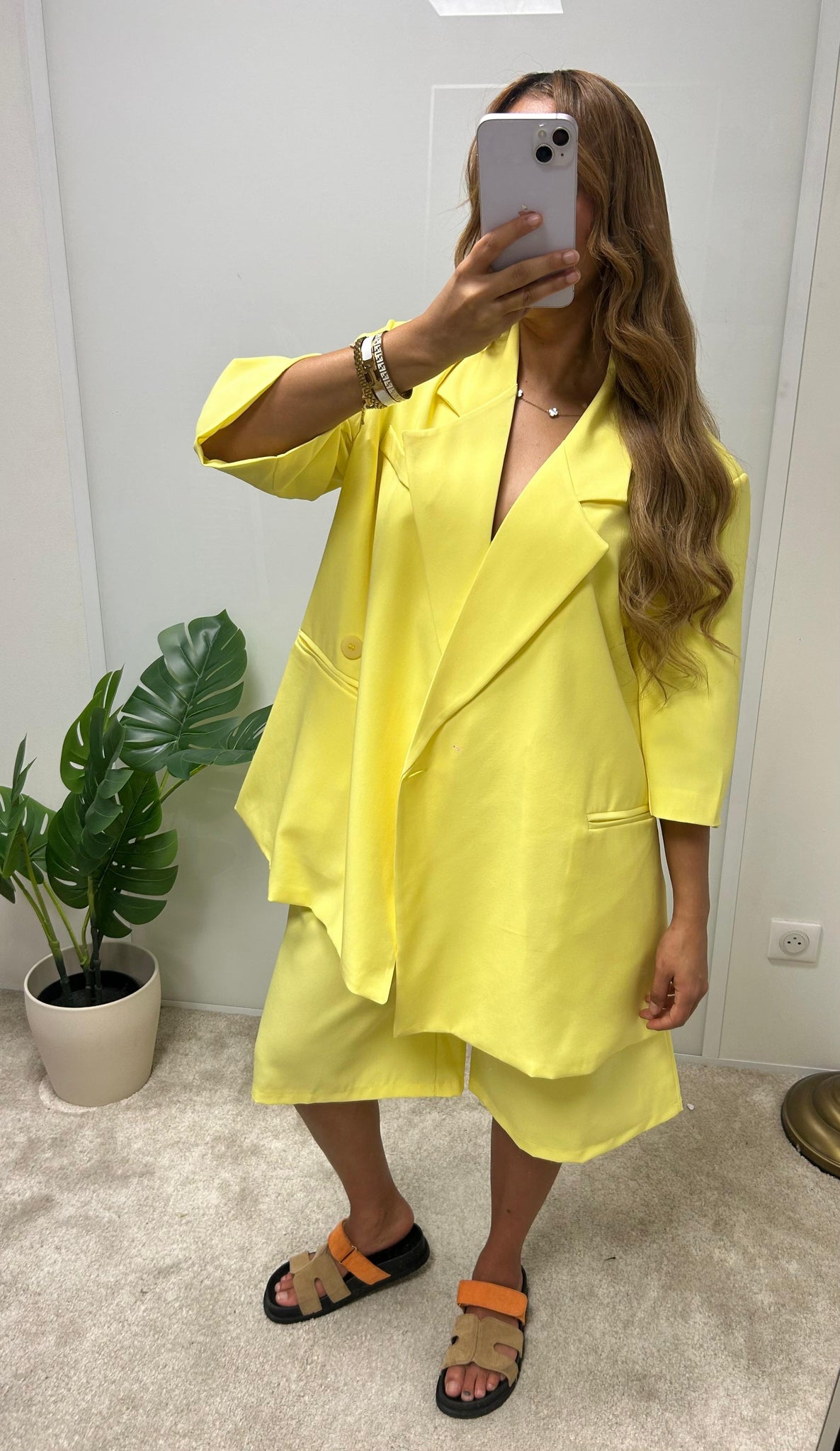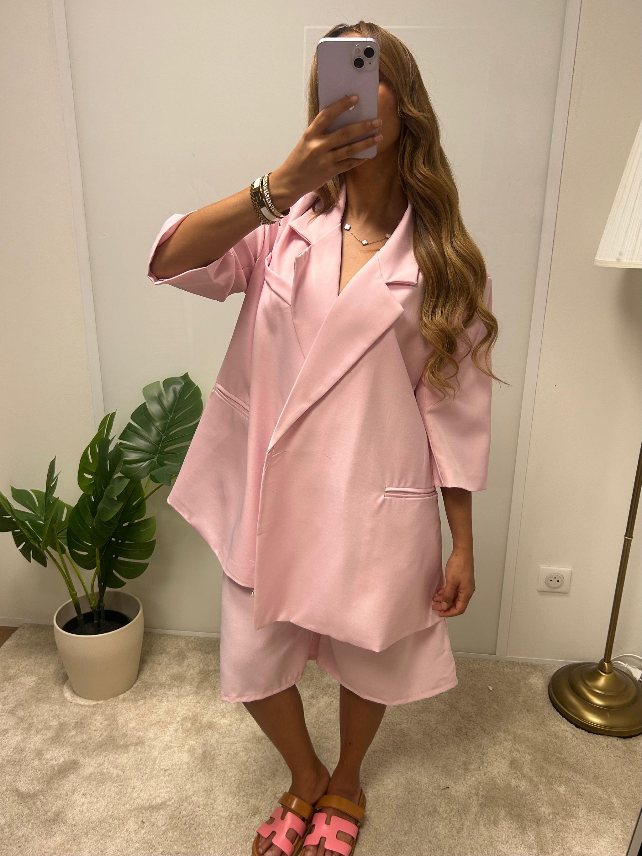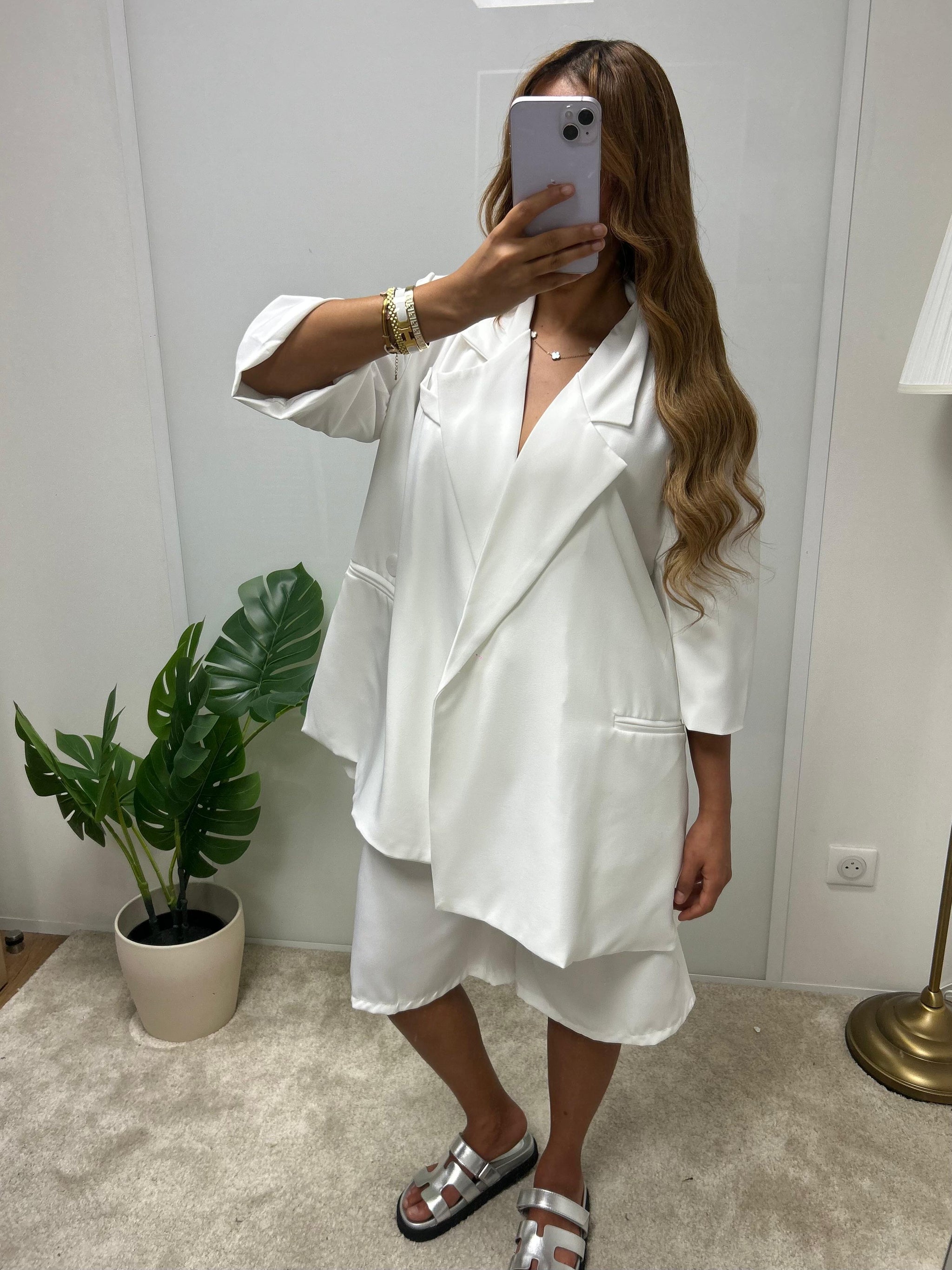 Ensemble composé d’un blazer à la coupe ample et structurée, associé à un short taille haute légèrement évasé. Un duo pensé pour créer une silhouette à la fois décontractée et affirmée, jouant sur les volumes tout en conservant une ligne nette.