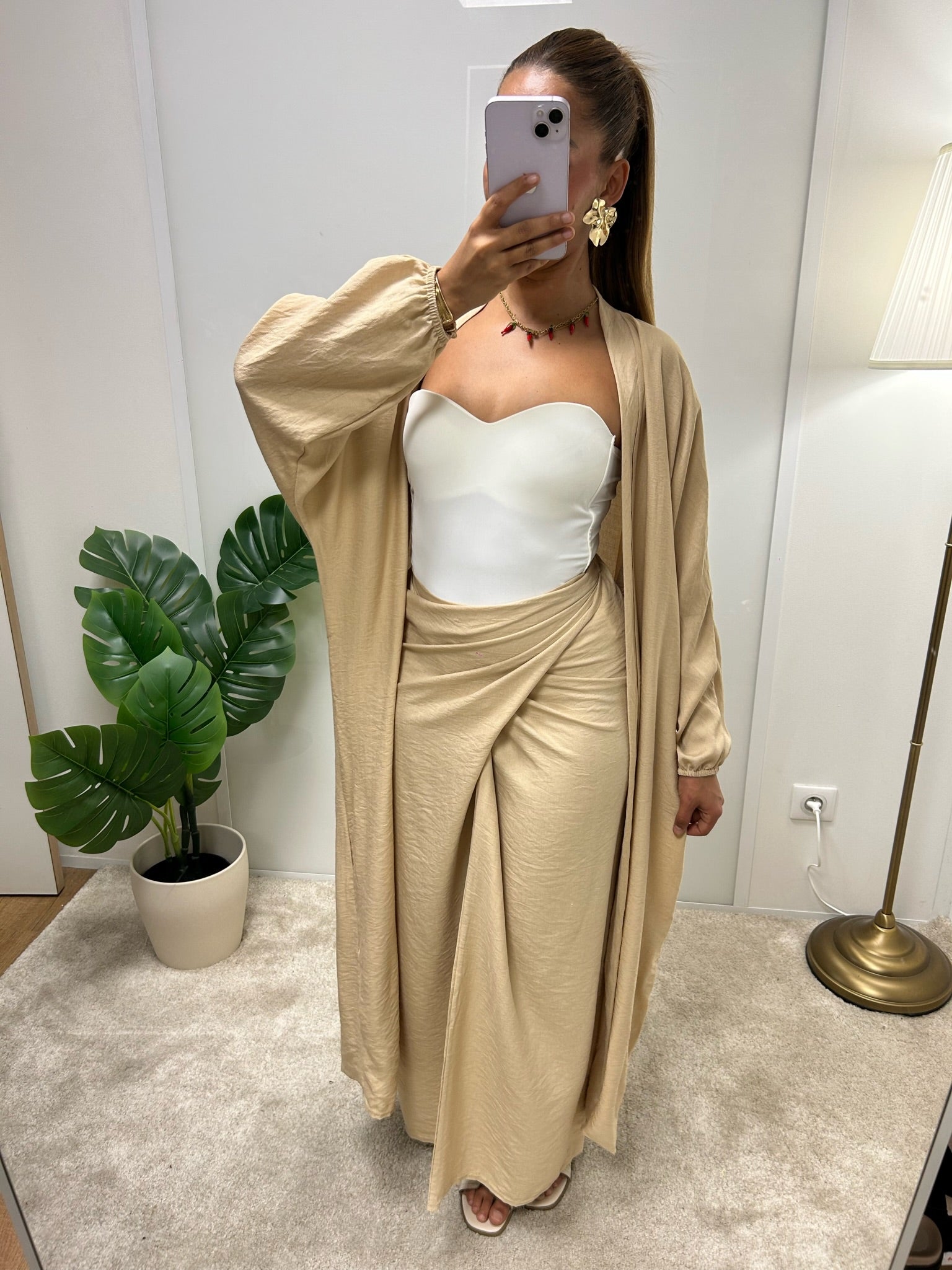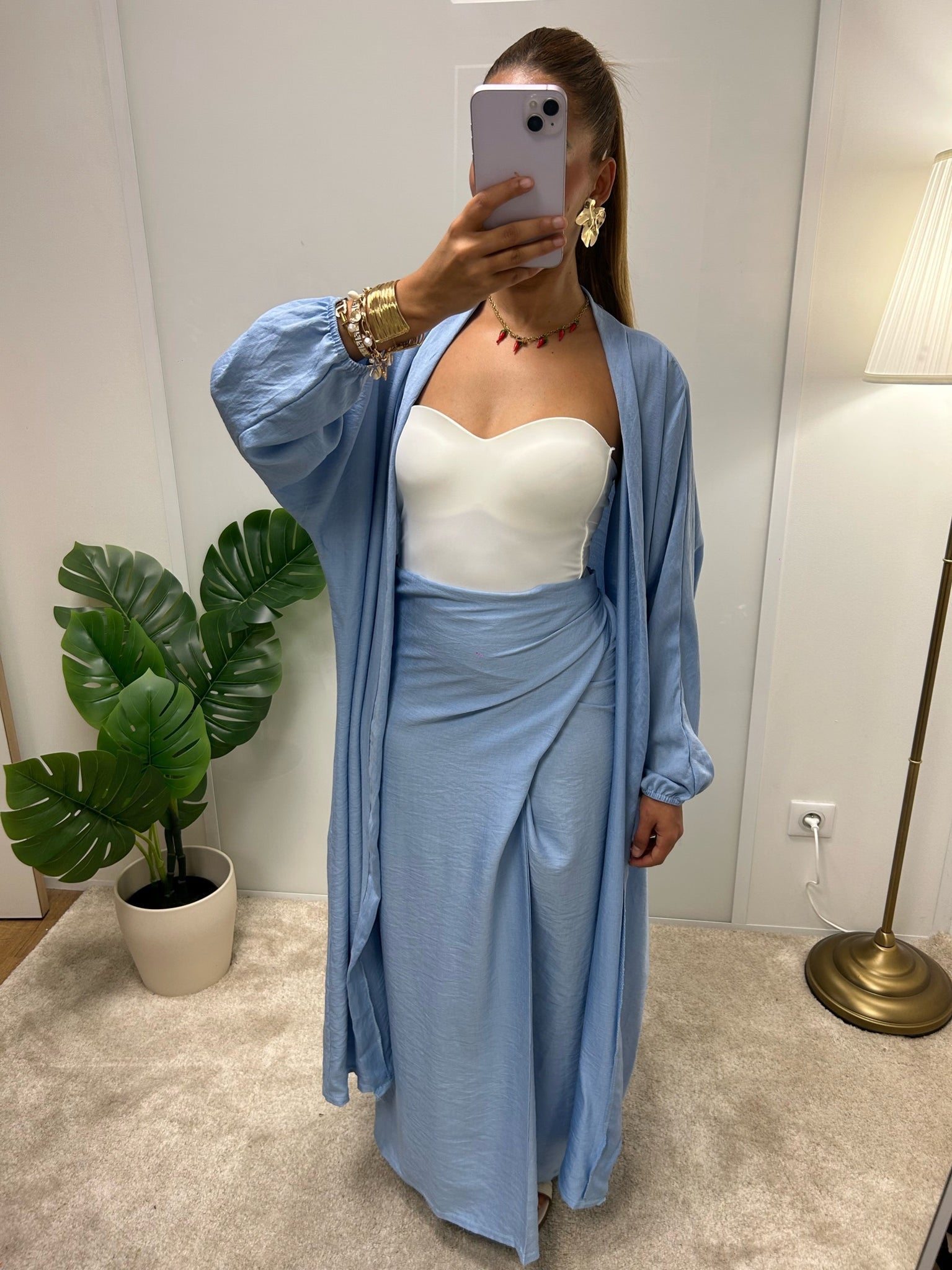 Adoptez une allure chic et confortable avec cet ensemble composé d’un kimono fluide et d’une jupe assortie,