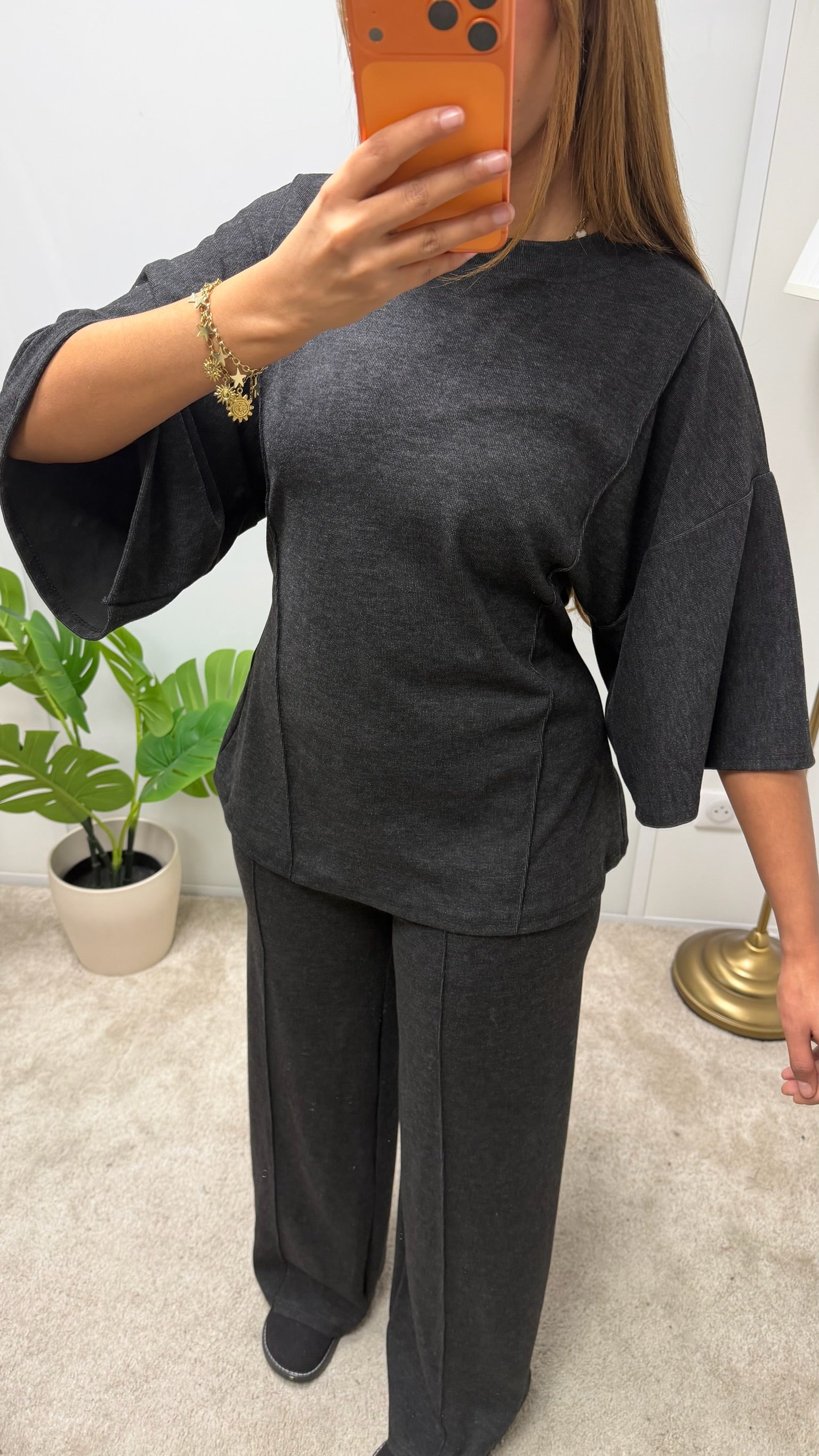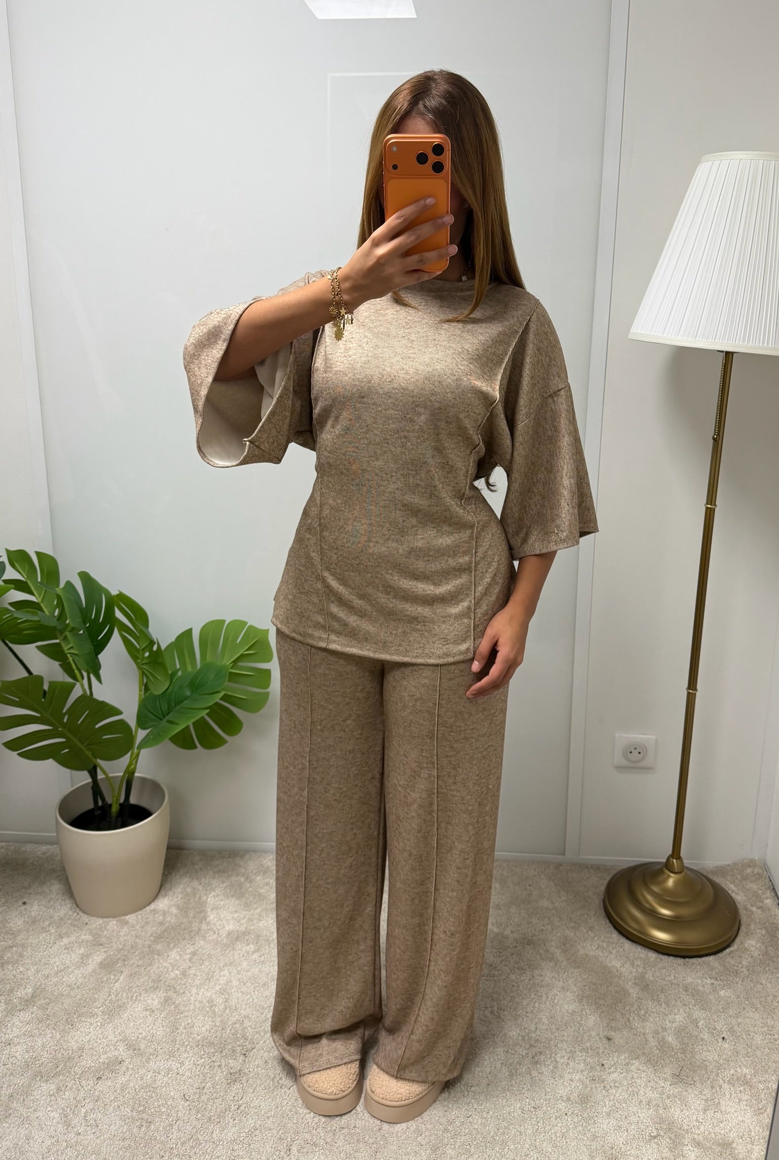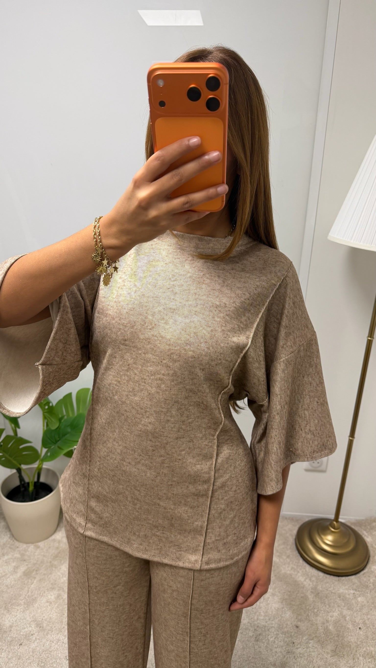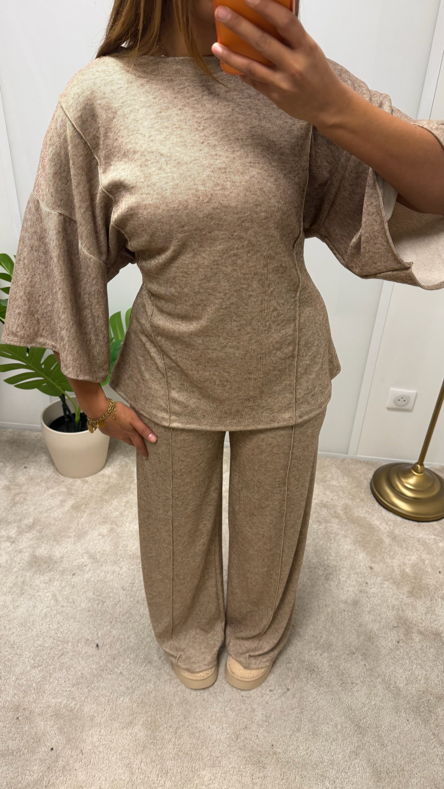 • Haut : coupe légèrement ample avec des manches évasées, offrant un tombé naturel et élégant.