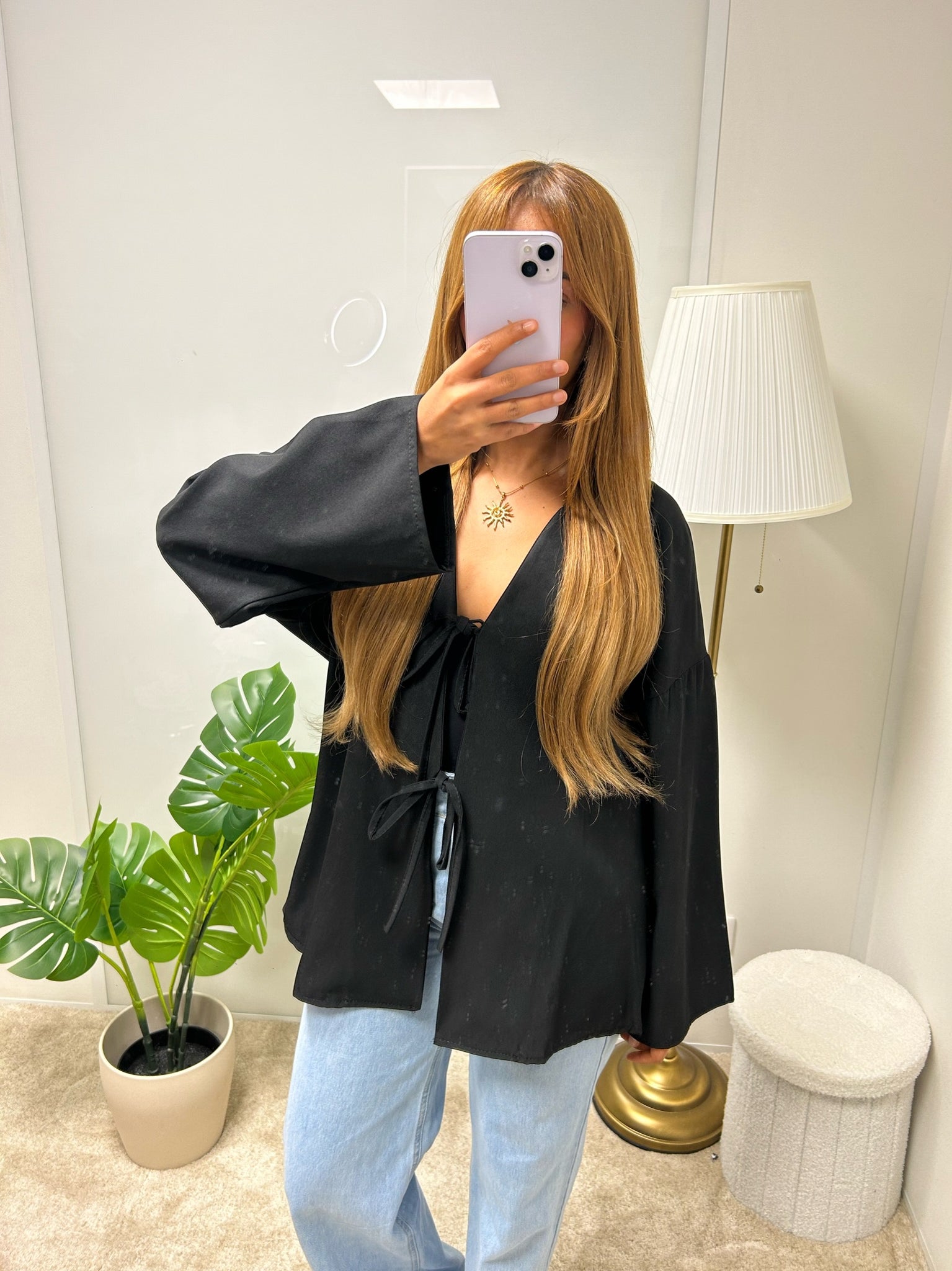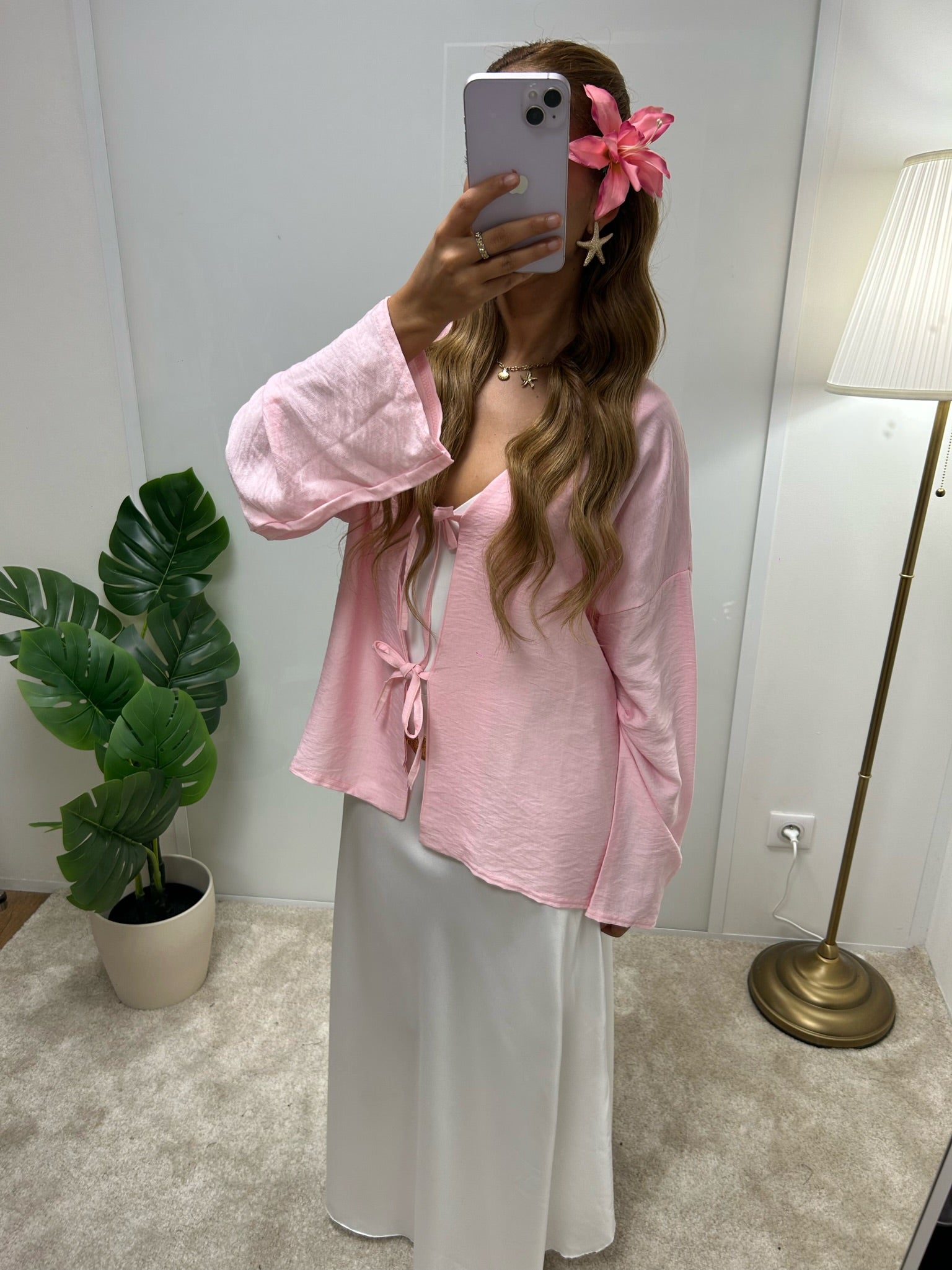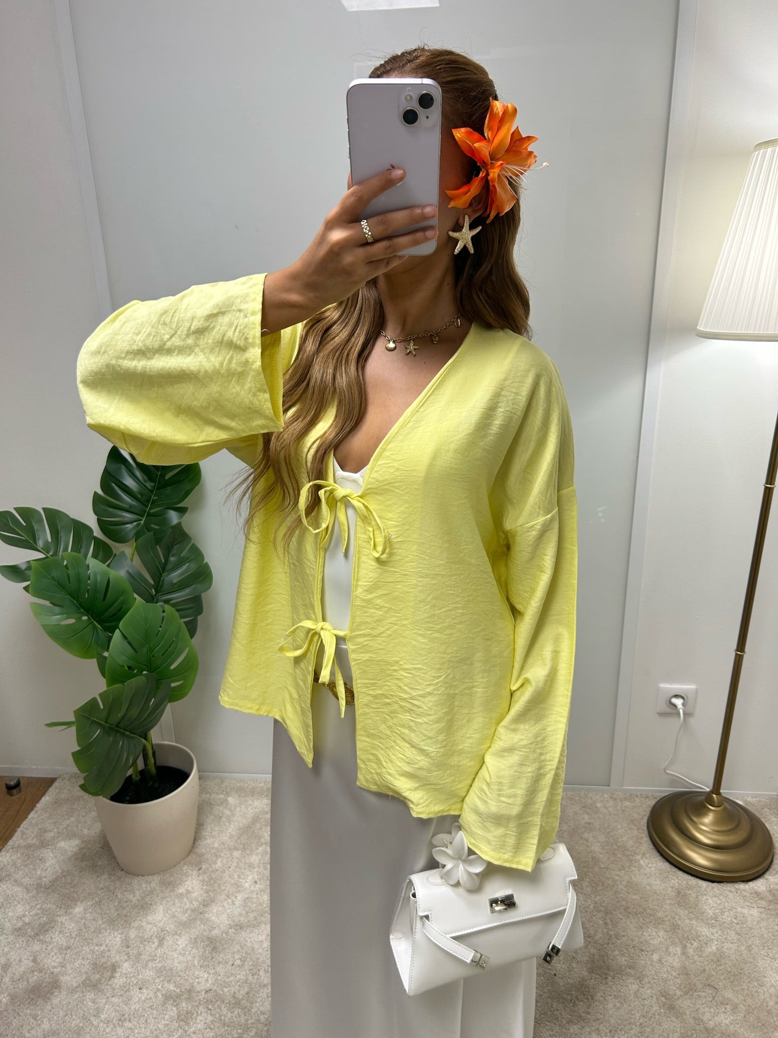 Une veste légère et fluide, au charme délicat avec ses liens à nouer sur le devant.