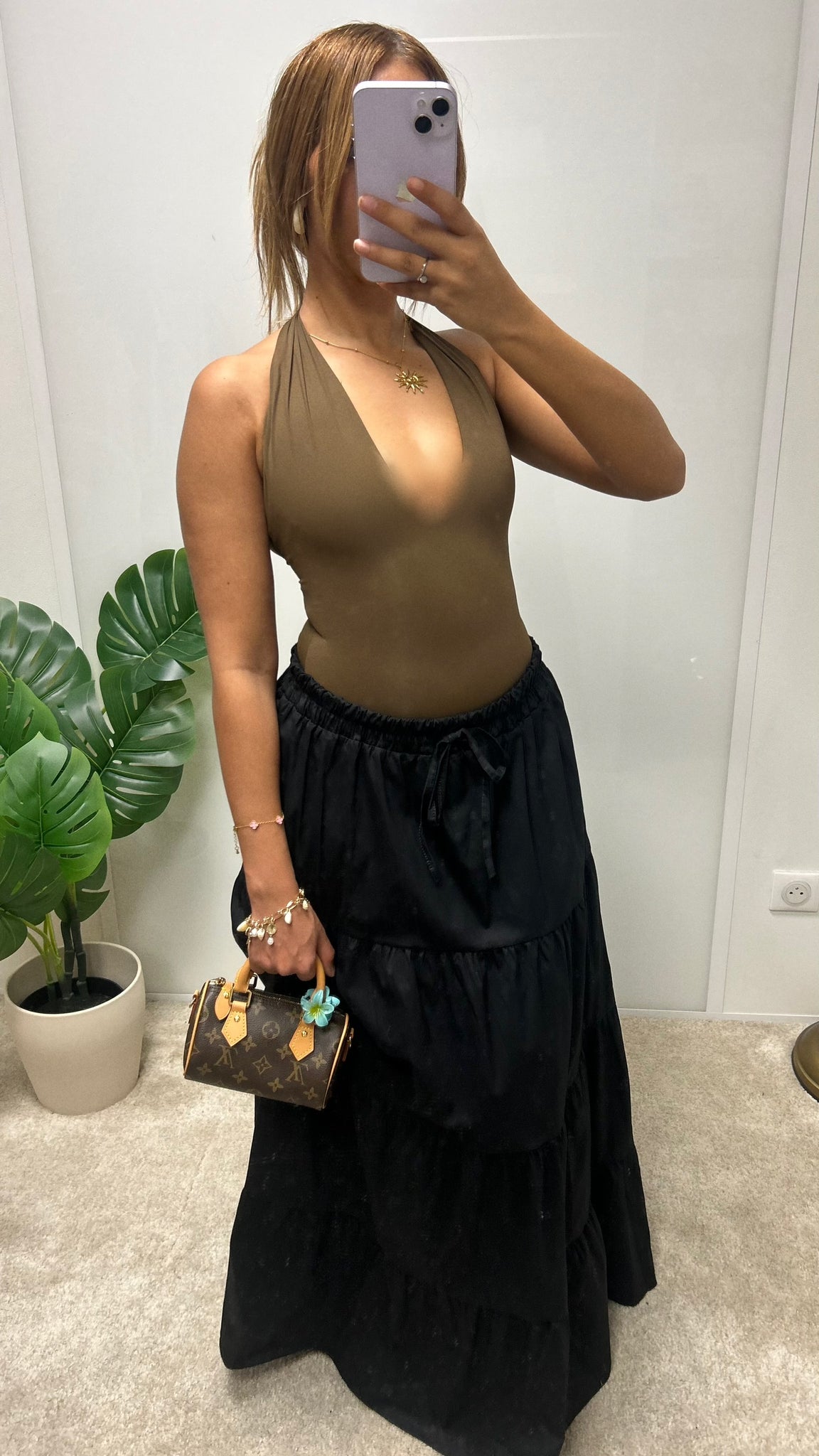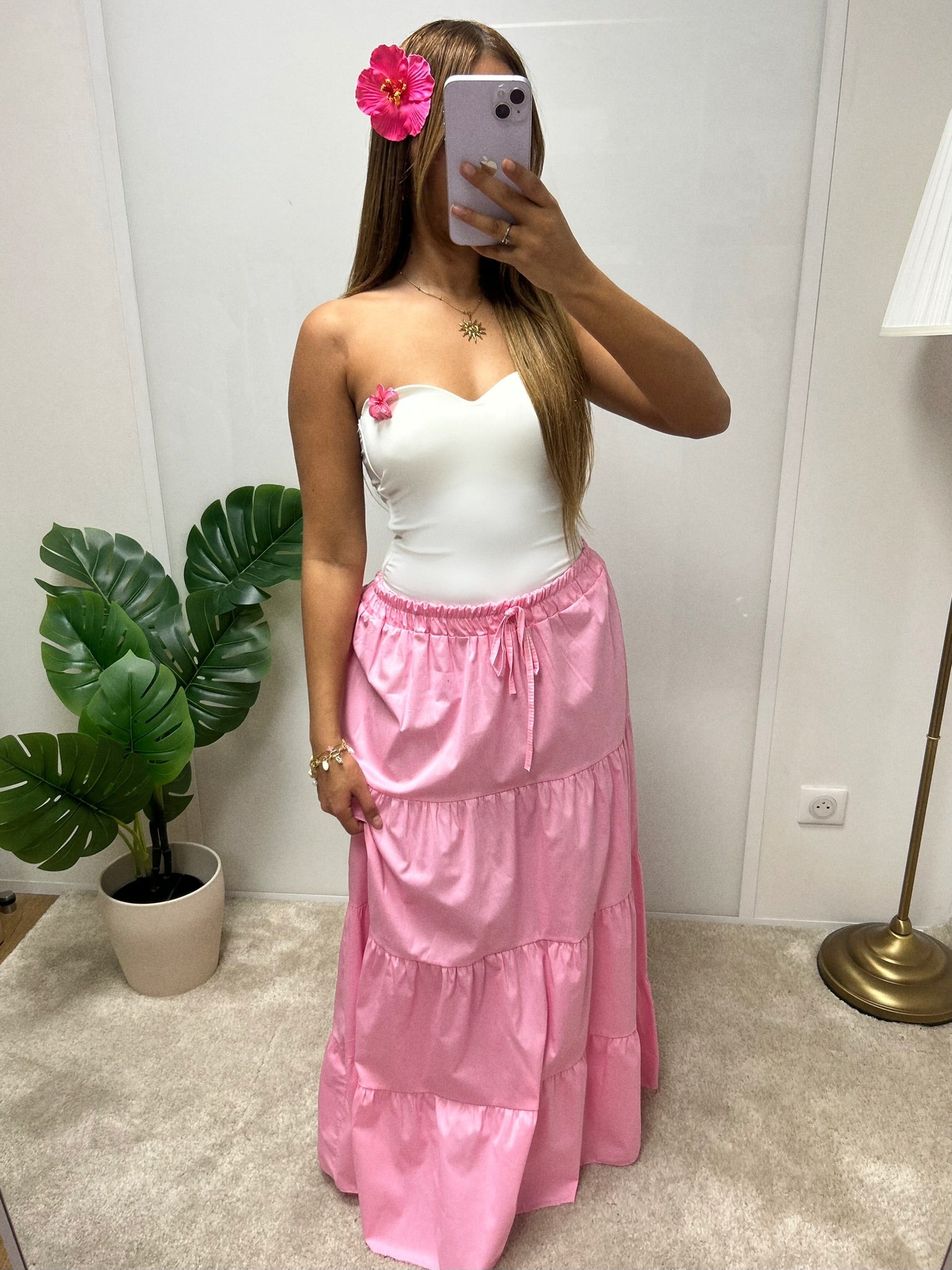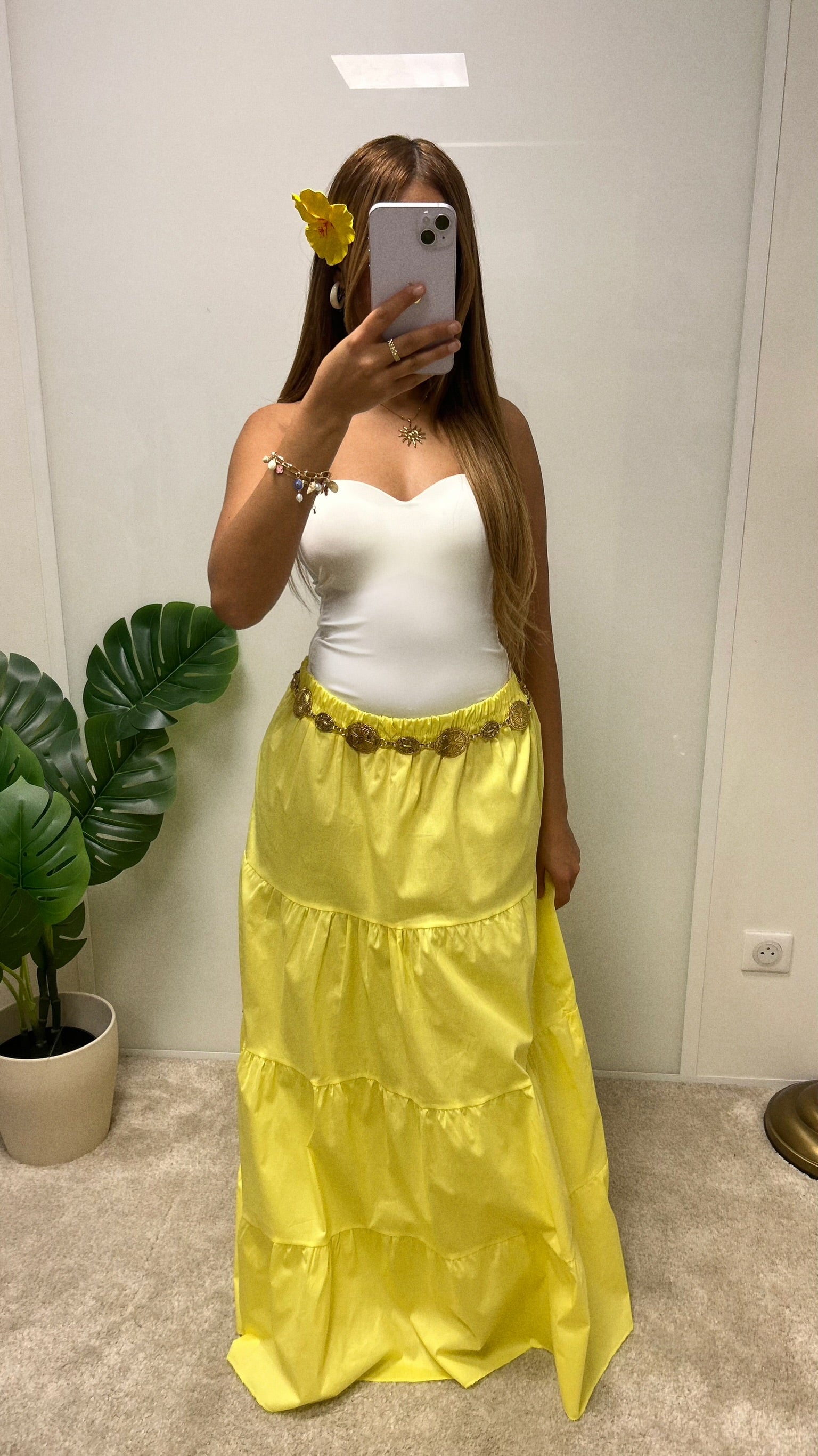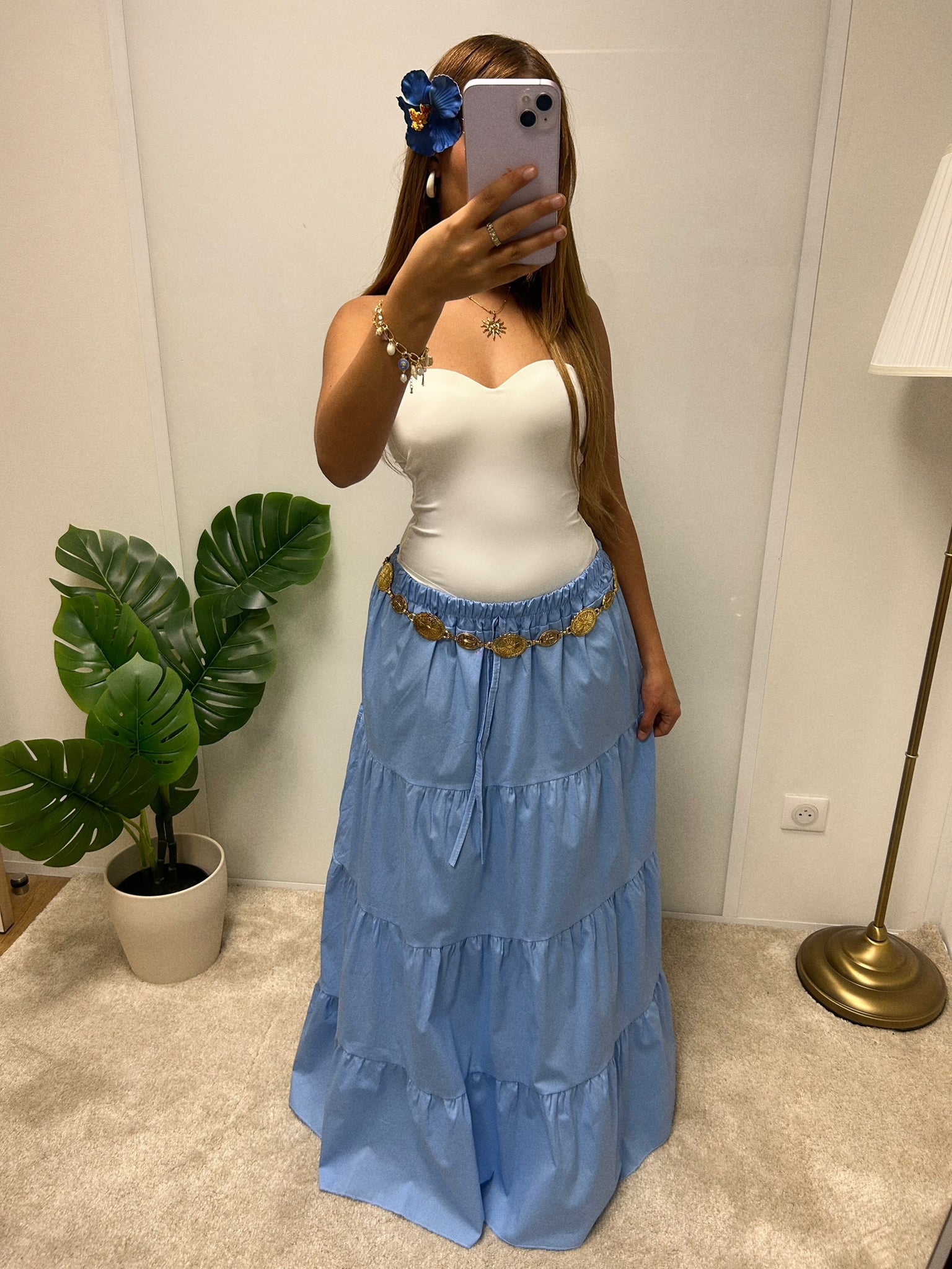 Jupe longue fluide à volants, idéale pour l’été grâce à sa coupe légère et confortable. Sa taille haute à lien apporte une touche bohème et met en valeur la silhouette.